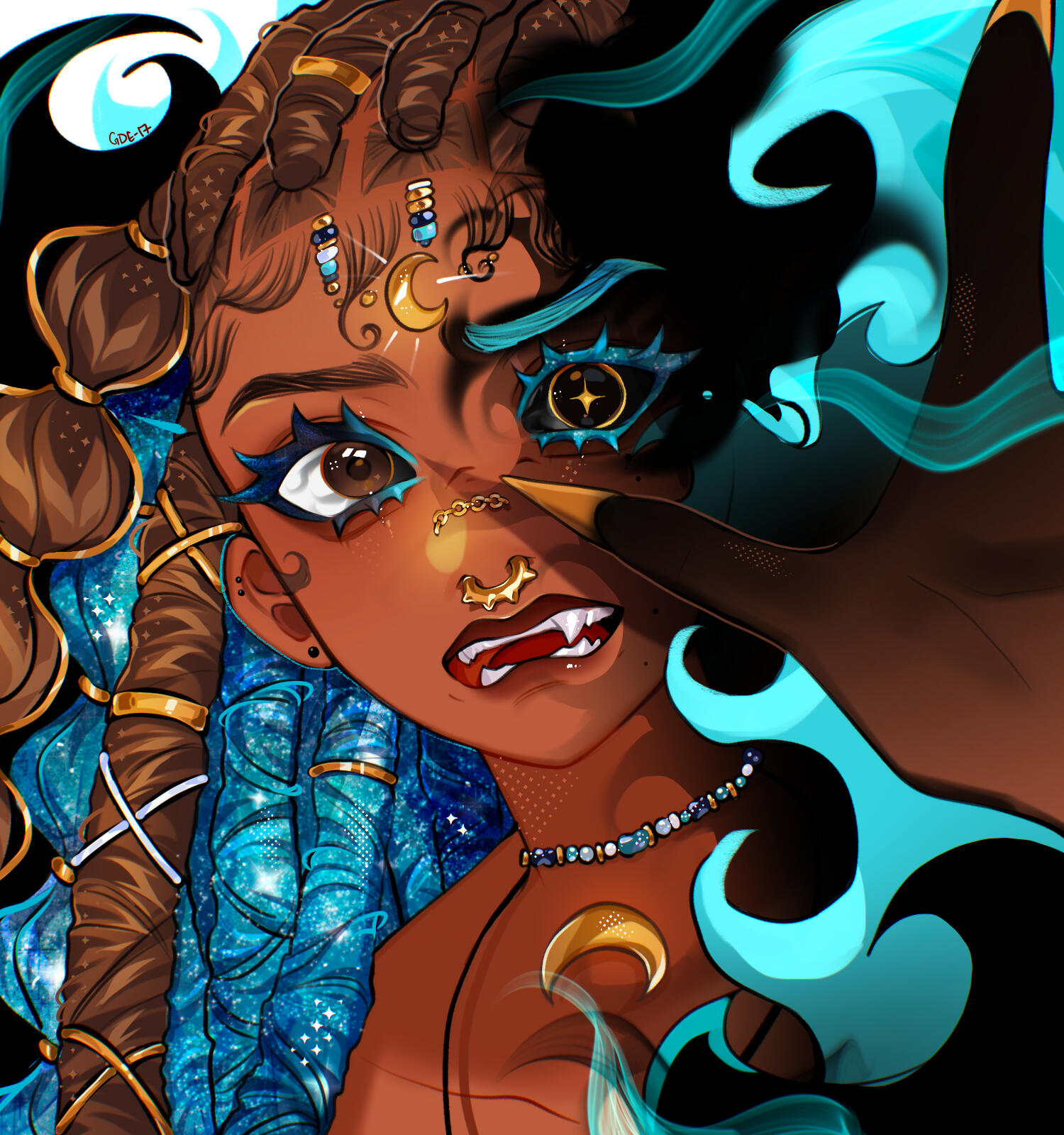 Hair: Waterfall Locs, Goddess Locs, Bubble braids, Baby hair’s, Half/Back of hair is teal with stars/galaxy in it.